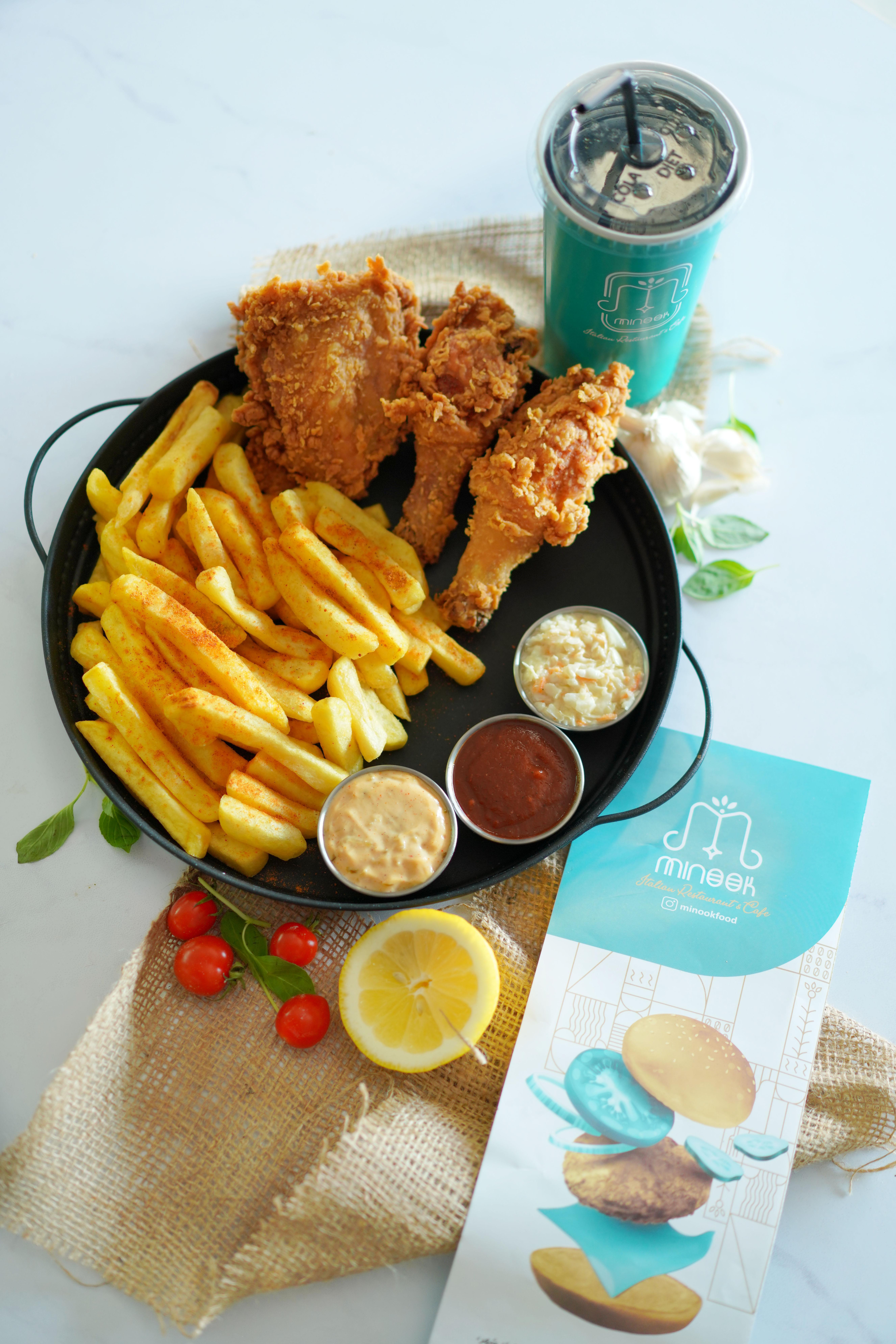 ۴تکه ران، ۲تکه فیله، ۴عدد کتف و بال اسپایسی، ۴حلقه پیاز سوخاری، سیب زمینی، قارچ، نان، سالاد کلم، سس